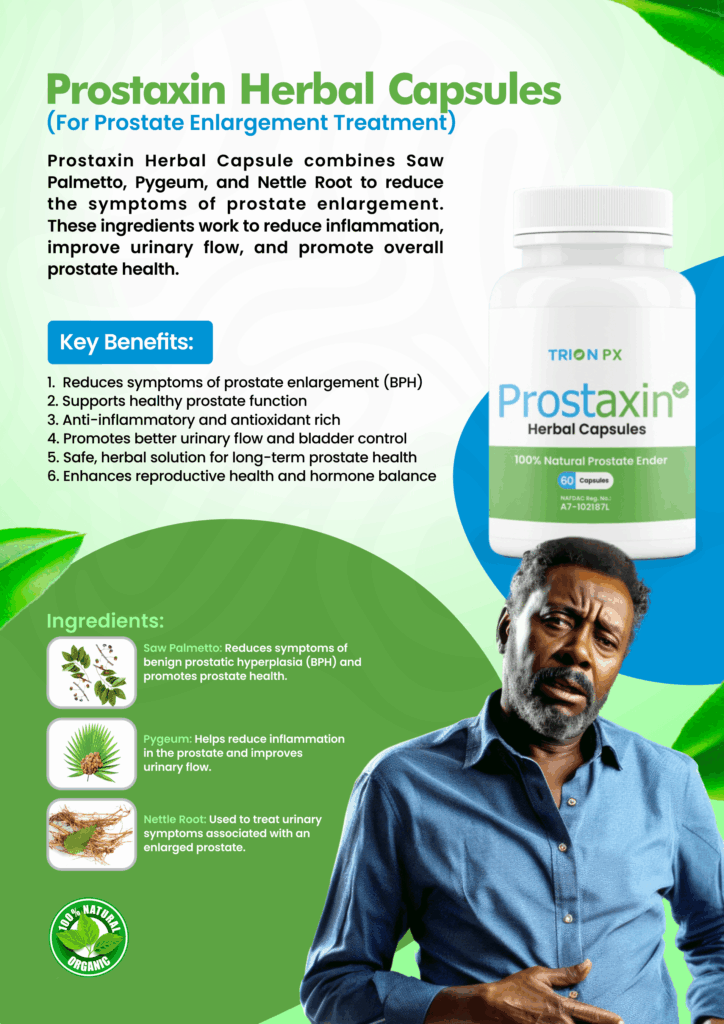 PROSTAXIN Herbal Capsules are a natural dietary supplement formulated to support prostate health and alleviate the common symptoms associated with prostate enlargement (Benign Prostatic Hyperplasia – BPH). It combines powerful herbal extracts like Saw Palmetto, Pygeum, and Nettle Root.